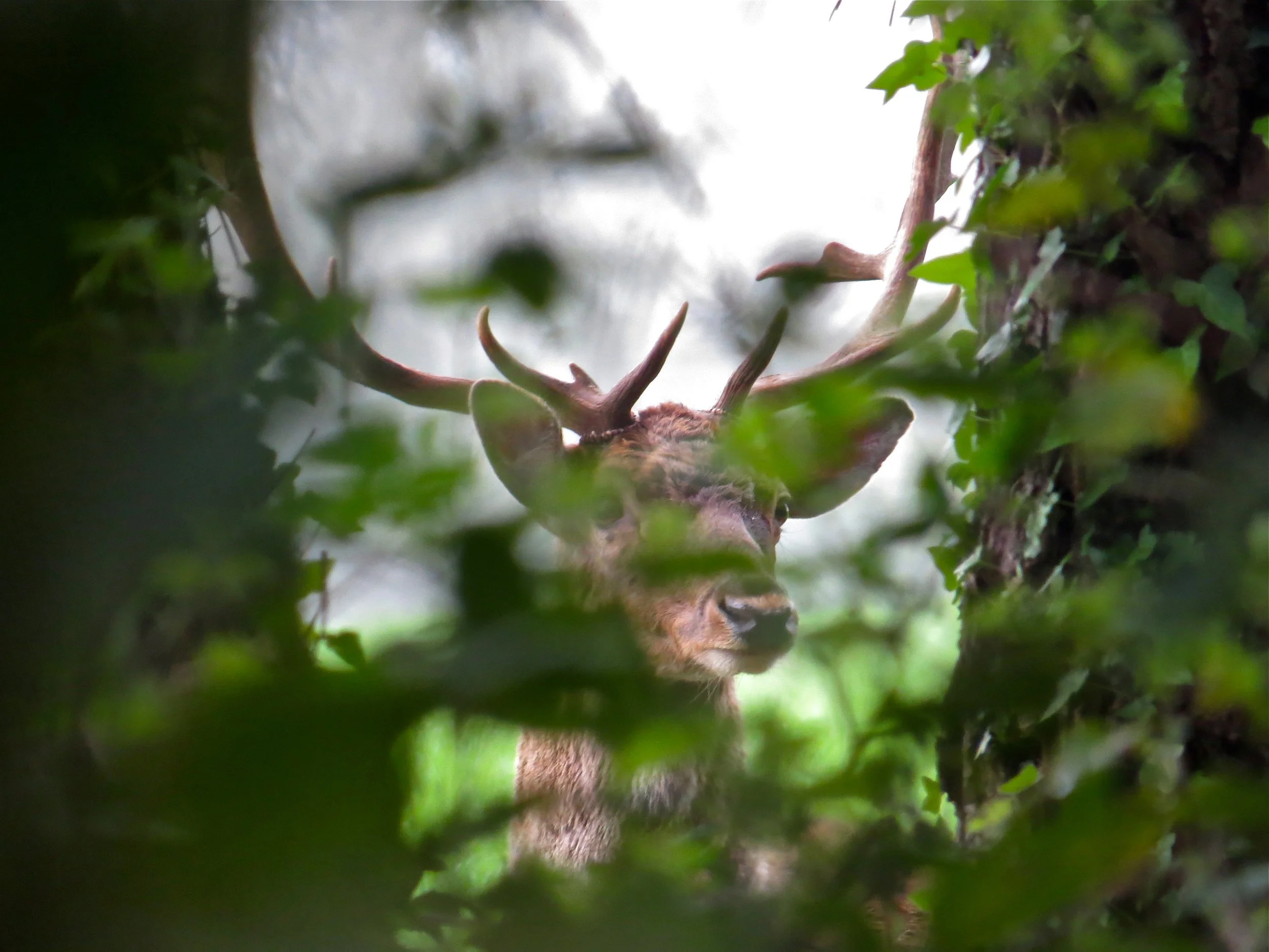 A majestic deer hiding behind the bush in the Po Delta – a serene encounter in Italy’s awakening summer landscapes.